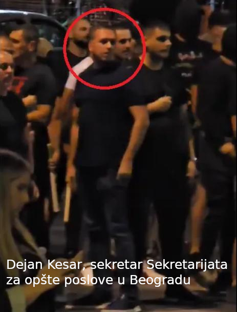 Takodje još jedna vest sutradan vezana za 14.avgust. Dejan Kesar, sekretar Sekretarijata za opšte poslove u Beogradu bio je u četvrtak uveče sa grupom batinaša koji su nosili drvene palice u centru grada. Kako se može videti na snimku, Kesar nije krio svoje prisustvo u grupi muškaraca koji su nosili kačkete, crne majice ali i drvene palice u Ulici kneza Miloša. Kesar se hvalio kako je na protest 15. marta doveo 200 ljudi kod Glavne pošte, ali i da “lema studente”. Dejan Kesar je zaposlen na mestu sekretara Sekretarijata za opšte poslove grada Beograda.