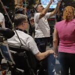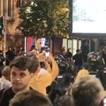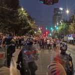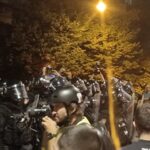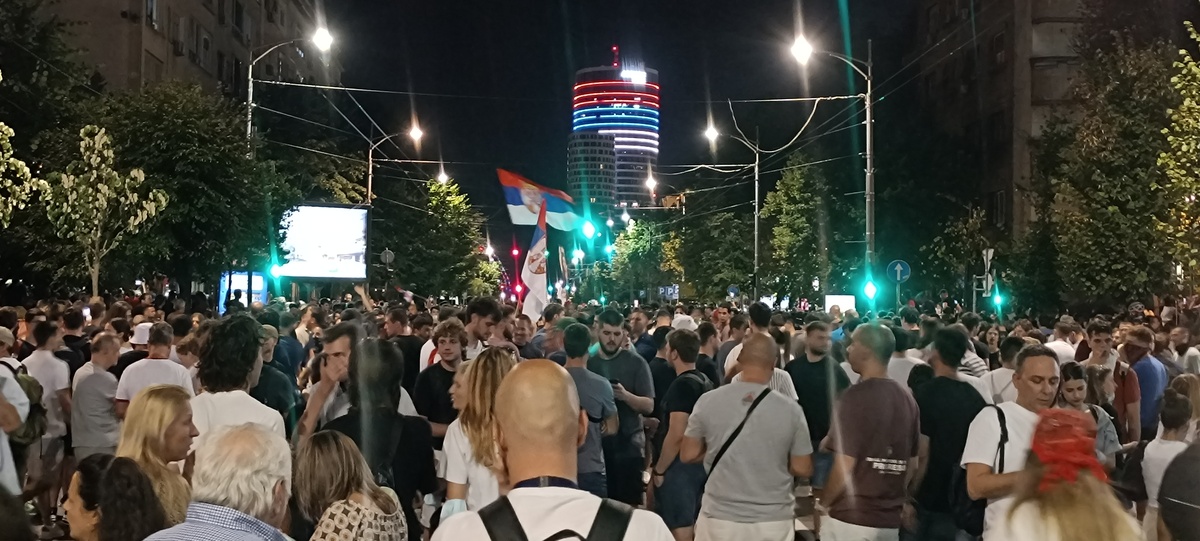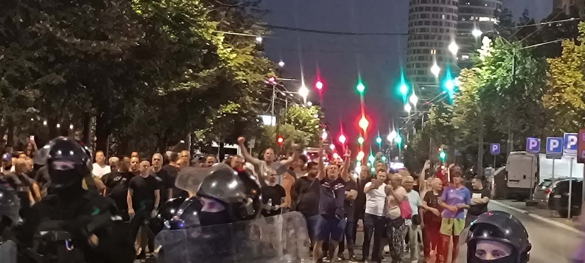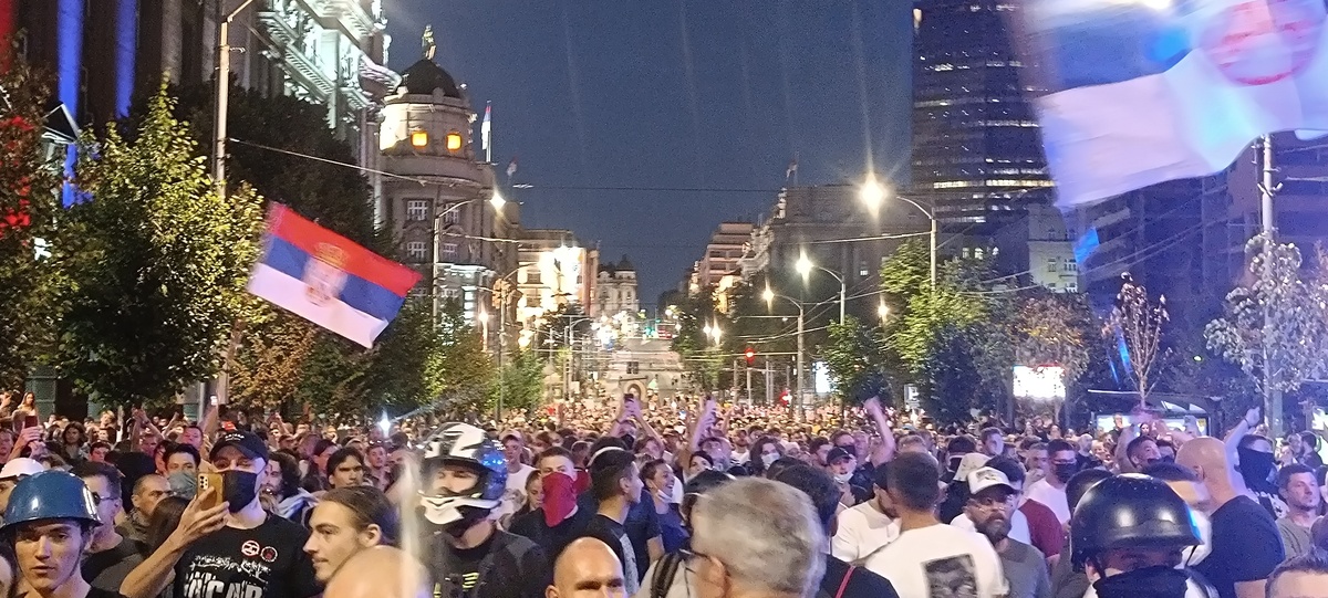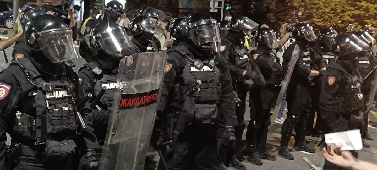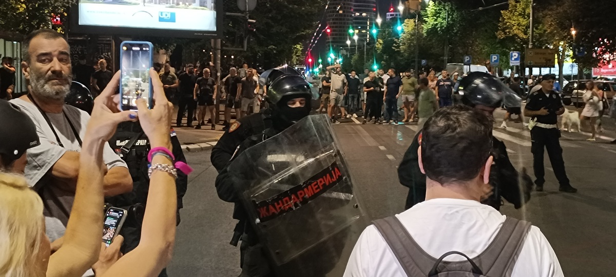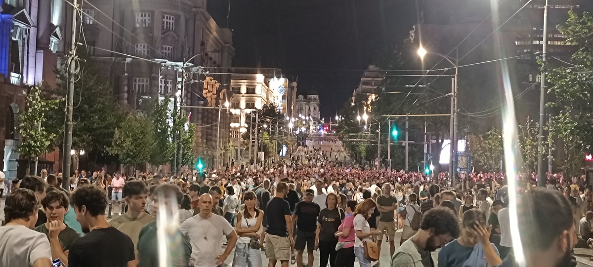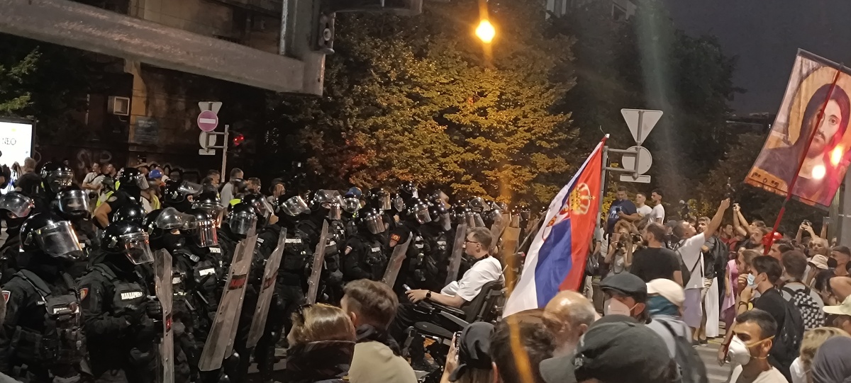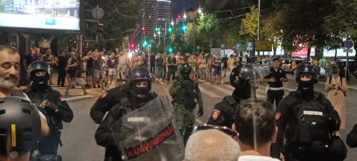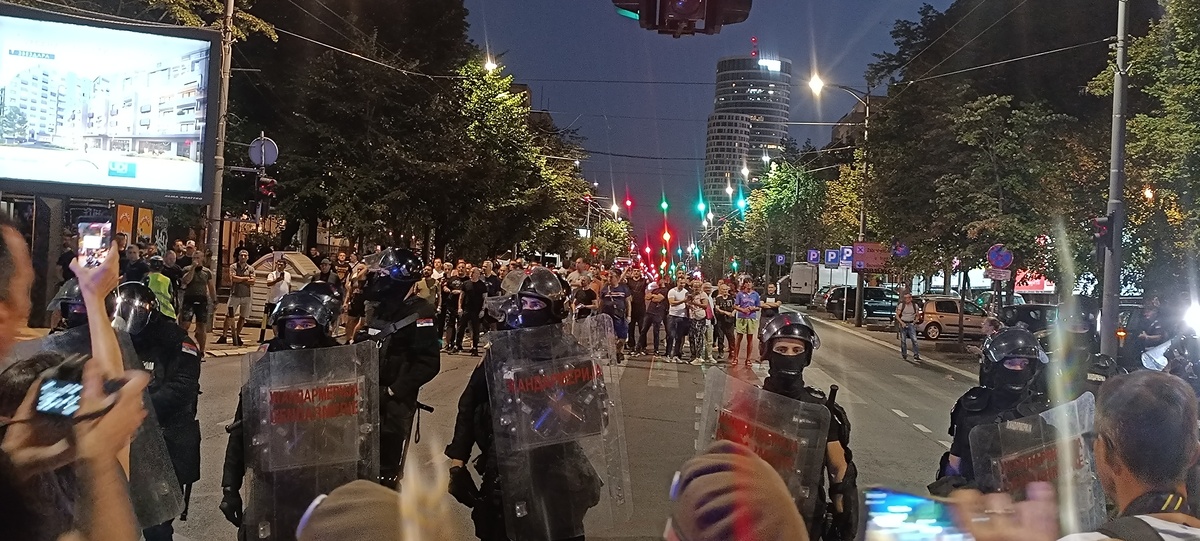 14.avgusta protesti su se održali u gomili gradova a ja sam u Beogradu skočio u 19:30h do Nemanjine, kako vole da kažu kod Generalštaba. Mislio sam da za razliku od prošle noći sada neće biti sukoba jer u Nemanjinoj nema SNS kriminalaca, nisam se setio da u Kneza Miloša imaju mafijašku kancelariju. Dakle, otprilike sat vremena smo stojali na raskrsnici, na bildbordu je pisalo 30 stepeni iako je bilo 8 uveče, a onda je masa krenula da se kreće kroz Kneza Miloša, ja sam mislio možda zbog pandura. Onda smo stali na 50m od pomenute kancelarije i tamo je bila mala gomila Vučićevih kriminalaca. Odmah se pojavila i policija tako da je jasno da sve koordinišu, poredjala su se tri kordona kučića kod nas, ne kod njih naravno, tako da su ljudi sa obe strane dobacivali jedni drugima a sa naše strane se svadjali sa pandurima, a panduri su s vremena na vreme gurali naše redove. I dečko u invalidskim kolicima se postavio na metar od pandura, imali su napisano na štitovima: žandarmerija.