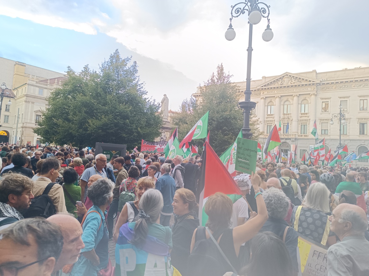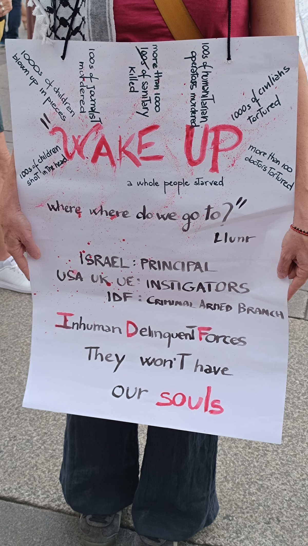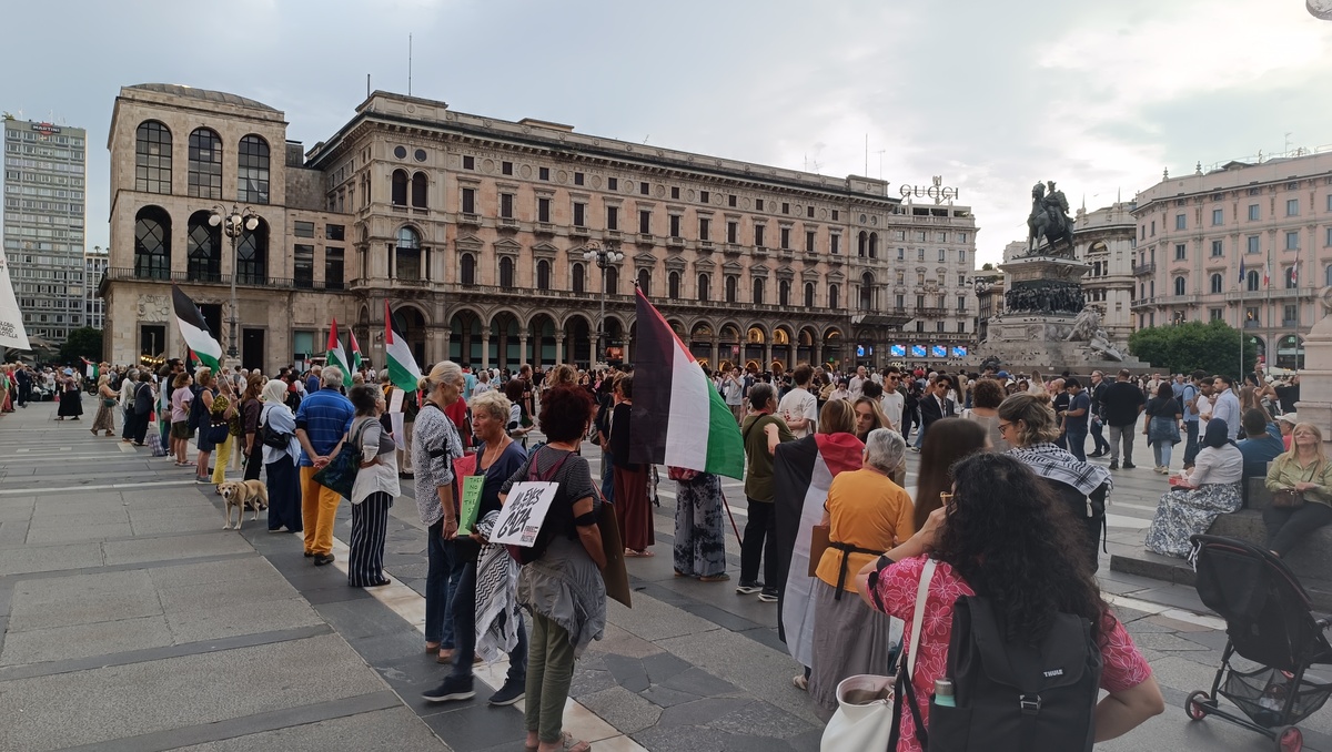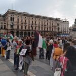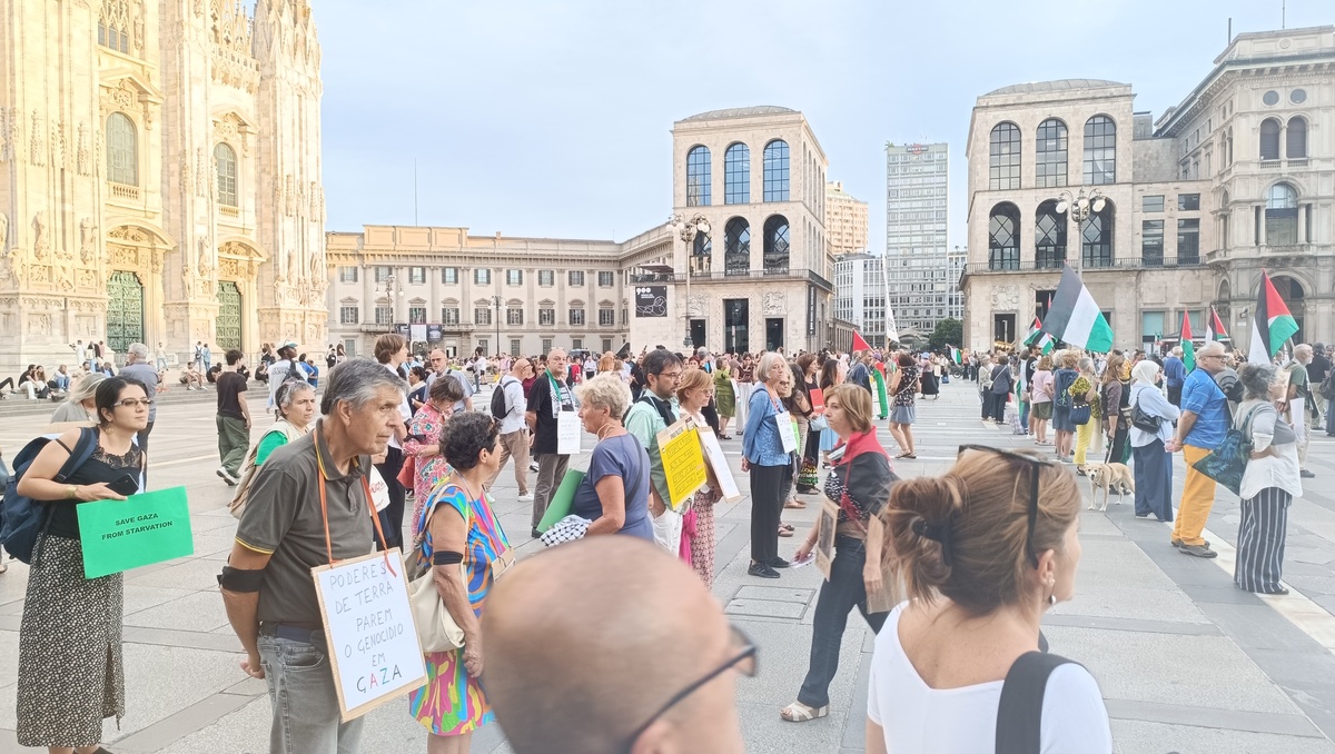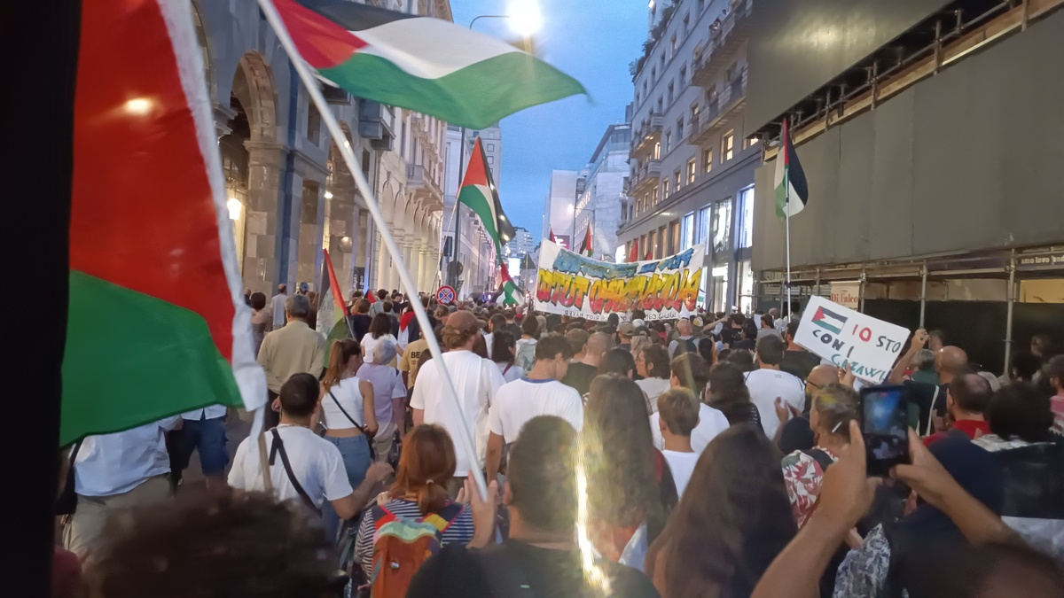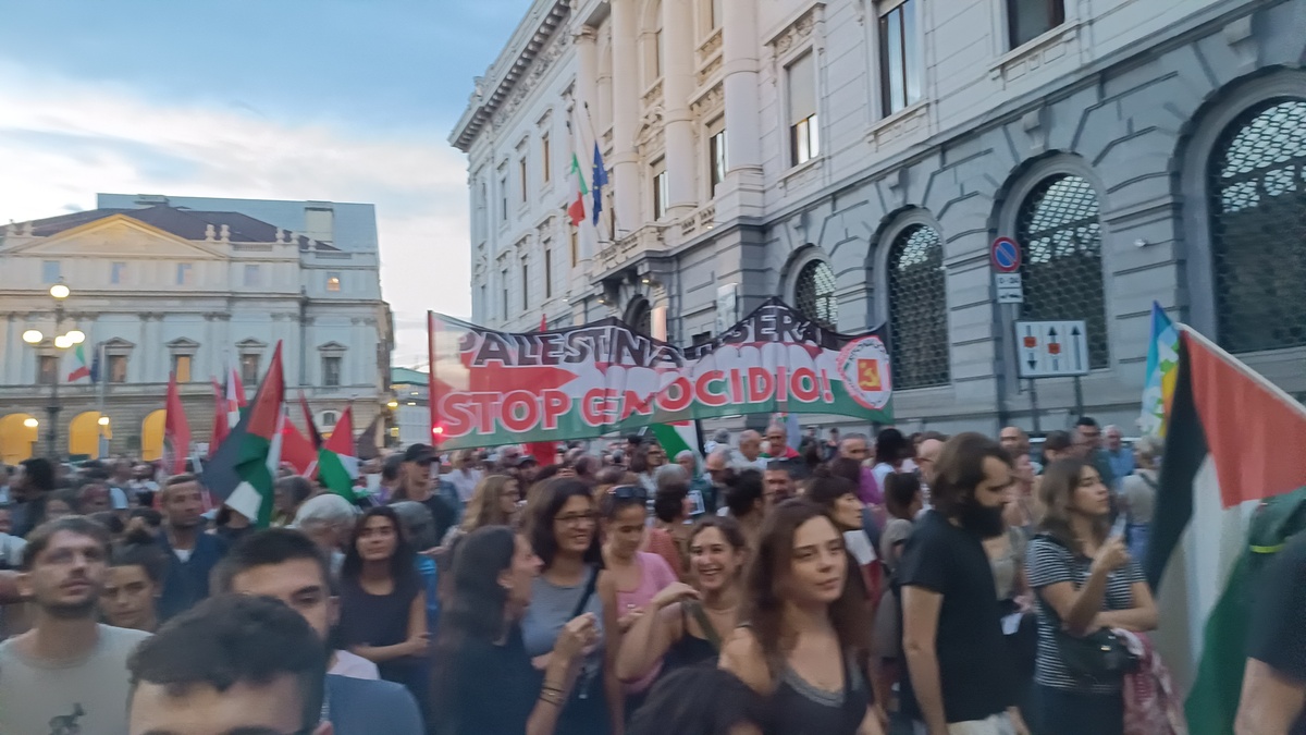 16 septembra sam naišao na objavu da je u 18:30h protest solidarnosti sa Palestincima nakon nekoliko noći sve žešćih bombardovanja od strane Izraela to jest izraelske vladajuće klase. Krenuo sam ka milanskom trgu Scala iza tržnog centra Duomo ali sam prelazio preko tog trga i video da su se tu poredjali a ne iza tržnog centra na trgu Scala. Bilo je mnogo redova sa ljudima ali bilo je više žena i devojaka koje su oko vrata nosile table sa natpisima o situaciji u Palestini, Duomo je ogroman trg gde ima uvek hiljade ljudi i turista i jebenih pandura tako da je taj trg odlično mesto da se protestvuje i privuče pažnja javnosti. Stao sam pored njih u redu i stjali smo tako više od pola sata sa tablama ćuteći a onda smo kroz tržni centar prošli do manjeg trga Scala gde su bili veliki baneri i gomila zastava, jedva smo se smestili jer je Scala mali prostor. Tu je neka devojka držala govor na italijanskom a onda smo krenuli ulicama u šetnju. Već je bilo 20h uveče kad smo stigli pored metroa San Babila tako da sam rešio da odatle odem jer su me noge već otkidale od šetanja prethodnih dana. To je dakle bilo 16tog a već 22 septembra će biti blokirana cela Italija, generalni štrajk u znak solidarnosti sa Palestincima, tako da se može reći da se dosta radi na medjunarodnom nivou za podršku Palestincima, uskoro će biti veliki protest solidarnosti i u Nemačkoj. Moraću da proverim da li će biti nekih blokada u Milanu 22.9 pa da se priključim pre nego što krenem dalje u drugu zemlju.