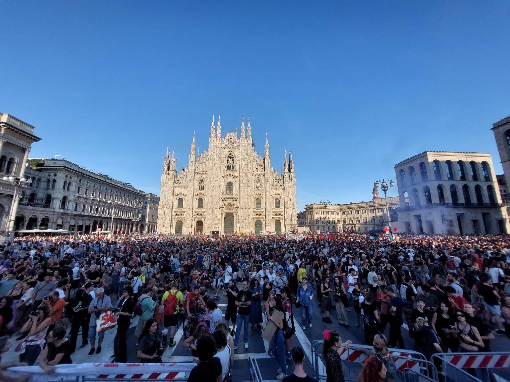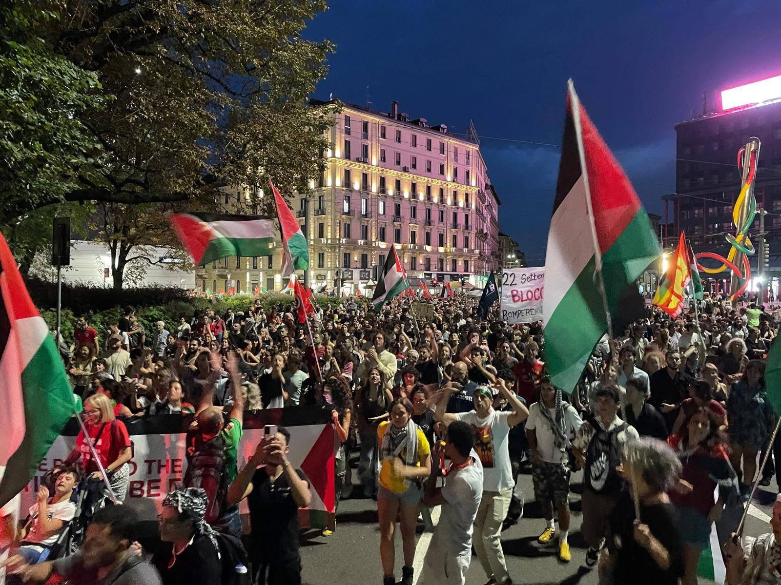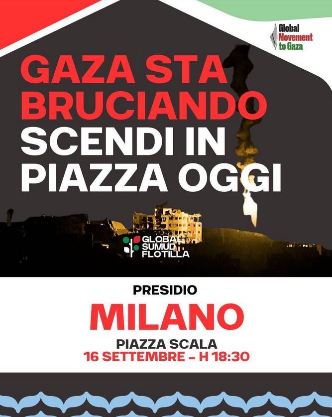 Večeras, 16. septembra u 18:30 časova, održaće se protest protiv bombardovanja i genocida u Gazi, a 7. septembra 80.000 ljudi protestovalo je protiv iseljenja levičara iz okupirane kuće, skvota Leoncavallo, od strane fašističkog ministra policije i njegovog tutora Meloni. Neki kažu da je bilo 20.000 ljudi – neki procenjuju da ih je bilo i do 80.000 – masa se pridružila protestu koji je krenuo ka trgu Duomo u centru Milana. Među prisutnim političarima bili su Nikola Fratojani, lider Sinistra Italijana (Italijanska levica) i Alesandro Kapeli, sekretar levocentričke Partio Demokratiko (PD) u Milanu, kao i Primo Mineli, predsednik Nacionalnog udruženja italijanskih partizana (ANPI) u Milanu. Prisustvovali su i predstavnici sindikata i građanskih udruženja, uključujući glumca Paola Rosija. Marš je pokrenut kao odgovor na iznenadno iseljenje dugogodišnjeg levičarskog skvota, u operaciji koju je sproveo rasistički ministar kučića Mateo Pjantedozi, uz podršku fašistkinje Meloni. Desetak demonstranata se odvojilo od skupa prema Prefekturi na Korso Monforte, bacajući petarde, dimne bombe i jaja na policiju.
