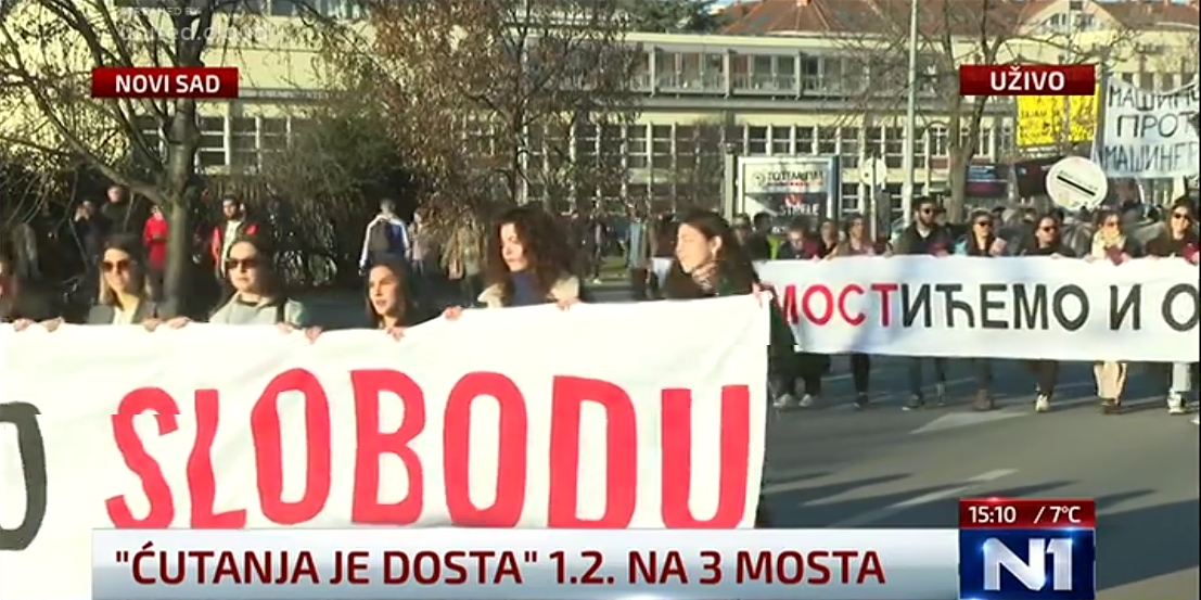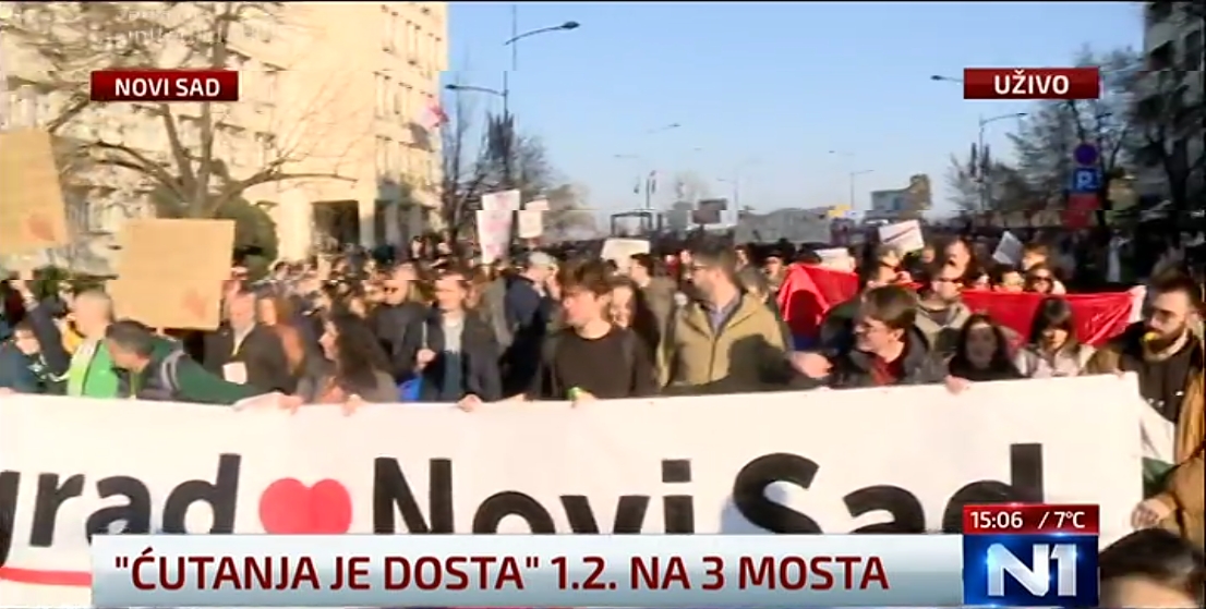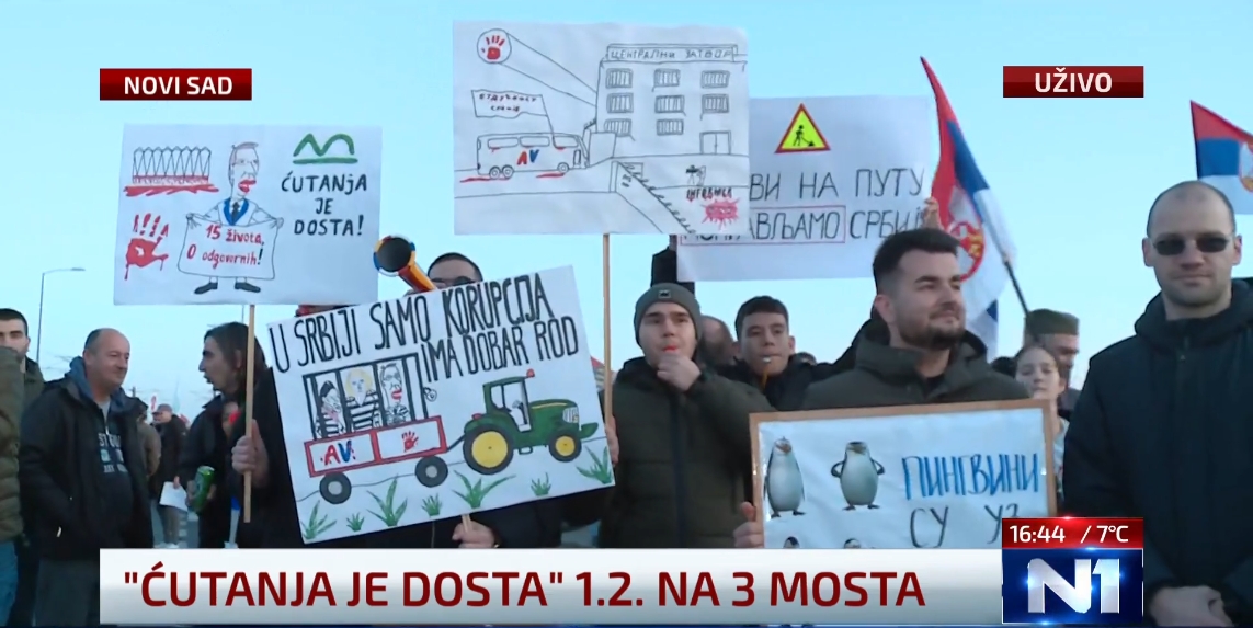U subotu 1 februara nije bilo protesta u Beogradu tako da su u centru pažnje studenti u Novom Sadu, priprema i blokada 3 mosta od 15h a i mnogi ljudi su otputovali u NS da zajedno blokiraju mostove. Studenti su krenuli ka mostovima u 14:30h a do tada su pravili transparente na fakultetu, više stotina bajkera su takodje došli iz Beograda, a gradjani su došli na mostove malo ranije tako da su bili tamo kad su studenti došli oko 15h. Dakle, dva mosta Žeželjev i Varadinski se blokiraju od 15-18h to jest 3 sata a most Slobode se blokira 24 sata. Most slobode je bio i srušen tokom NATO bombardovanja tako da je most značajan a novinari N1 su rekli da je njihova novinarka na mostu unuka arhitekte koji je napravio taj most. A Varadinski most je već bio pun sa gradjanima i kad su studenti stigli u 15:40h nisu mogli da udju pa su ostali pored mosta. Nakon toga je tekla blokada a studenti su izjavili da će biti problem da se svi smeste na mostu slobode 24 sata jer most može da se sruši i zato će redari da puste samo jedan deo ljudi na most a svi ostali će biti na ulazu u most. U 17:30h ljudi su već krenuli polako sa ova dva mosta ka mostu slobode. Ja mislim da su džabe napravili paranoju i ne može tako lako da se sruši most, mogli su da budu svi na mostovima. Pošto se ne može na Most slobode, glavna bina je postavljena ispred zgrade NIS-a, a u Limanskom parku su organizovane različite sportske aktivnosti a biće i bioskop tokom noći. Dakle, od 19h svi su zajedno na mostu slobode do sutra u 15h a imaće razne sportske i kulturne aktivnosti i govorancije. Bile su govorancije do ponoći, glumci, voditelji, profesori…