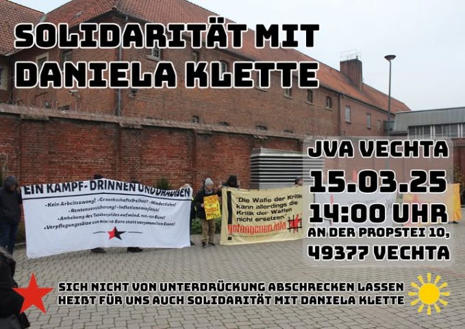 Nakon 15 marta, sledeći protest podrške Danijeli je 25 maja a u medjuvremenu joj je počelo sudjenje u gradu Celle od 25 marta i trajaće do 29 aprila kada će sudjenje biti preseljeno u grad Verde za maj. Sada se mogu slati pisma Danijeli na sledećoj adresi: Daniela Klette, JVA für Frauen, An der Propstei 10, 49377 Vechta, Germany.