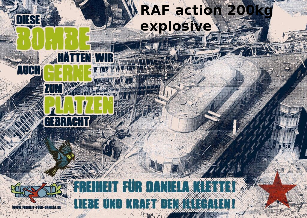 Daniela Klette, sada baka od 66 godina ali još uvek revolucionarka, je uhapšena februara 2024 godine u Nemačkoj nakon 30 godina bekstva zbog učešća u akcijama komunističke gerilske grupe RAF (treća generacija) koja je raspuštena još pre 30 godina ali se i dalje vodi lov na veštice i prave propagandu. Kad su je uhapsili držali su je pod kamerom, bez kontakta sa drugim zatvorenicima, nije mogla da prima poštu niti da ima olovku da piše pisma a advokati su pretresani kad joj dolaze u posetu. Stavili su je u Vechta zatvor a tužioci su iz malog grada Verden, prvo joj sude za optužnice da je godinama sa svoja dva druga pljačkala transporte novca da finansira svoj život u ilegali a kad joj završe sudjenje za krivična dela onda će joj suditi u Karlsruhe za učešće u RAF gerilskoj grupi za politička dela. Na primer optužuju je za postavljanje 200 kilograma eksploziva pored zatvora Weiterstadt, tako da je velika količina napravila dobru štetu tamnici vladajuće klase, pola zatvora je uništeno što se može videti na slici dole, što je po meni odlična akcija s obzirom da su rafovci bili studenti koji čitaju knjige pa su postali revolucionari a ne neki iskusni kriminalci, nije lako nabaviti toliko eksploziva i napraviti auto bombu. U svakom slučaju, anarhisti i marksisti joj pružaju podršku, 22 februara su napravili protest podrške za Danijelu u Berlinu i došlo je par stotina ljudi, stiglo je i pismo podrške iz grčkih zatvora od strane anarhističkih gerilaca u Koridalos zatvoru, Dimitra Z. & Marianna M., njihova pisma su pročitana na protestu. Nakon 22 februara organizovan je još jedan protest 15 marta ispred zatvora Vechta, Daniela ima tim za podršku a i levičarski časopisi kao Junge Welt prave članke o njoj da nema šanse da ima pošteno sudjenje što je i Daniela rekla u pismu iz zatvora.