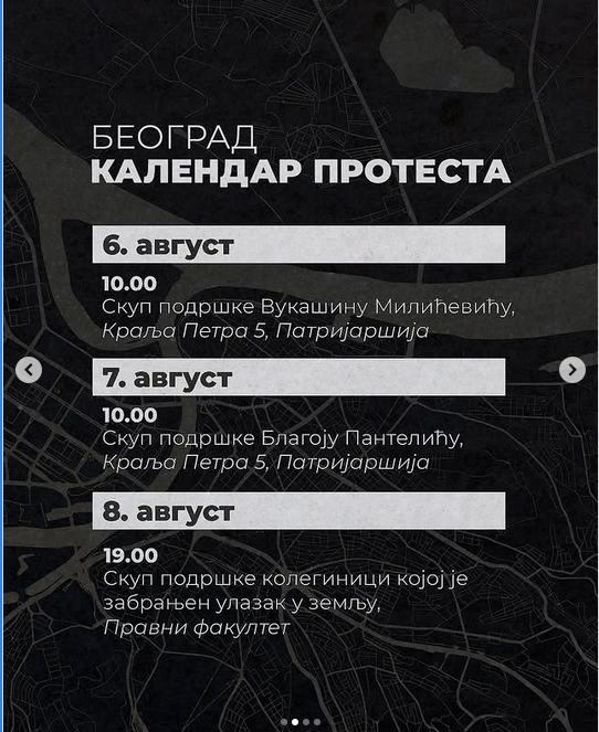 Za 8. avgust u 19 časova ispred Pravnog fakulteta u Beogradu najavljen je protest podrške studentkinji tog fakulteta kojoj je zabranjen ulazak u Srbiju.