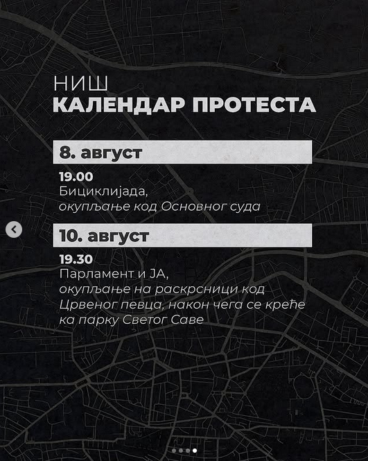 Niški studenti u blokadi pozvali su na “biciklističko-roleraško-trotinešku blokadu” 8. avgusta u 19 časova ispred Osnovnog suda, kao i na skup “Parlament i ja” 10. avgusta u 19.30 časova.